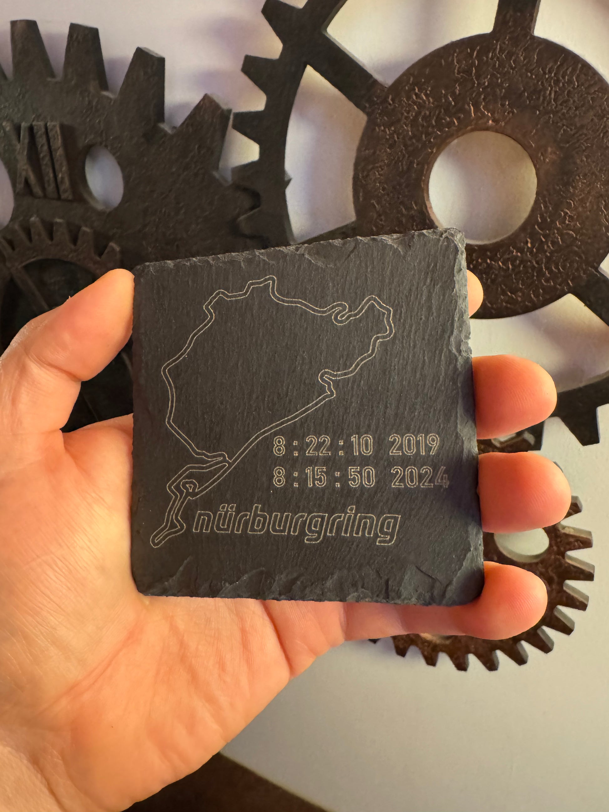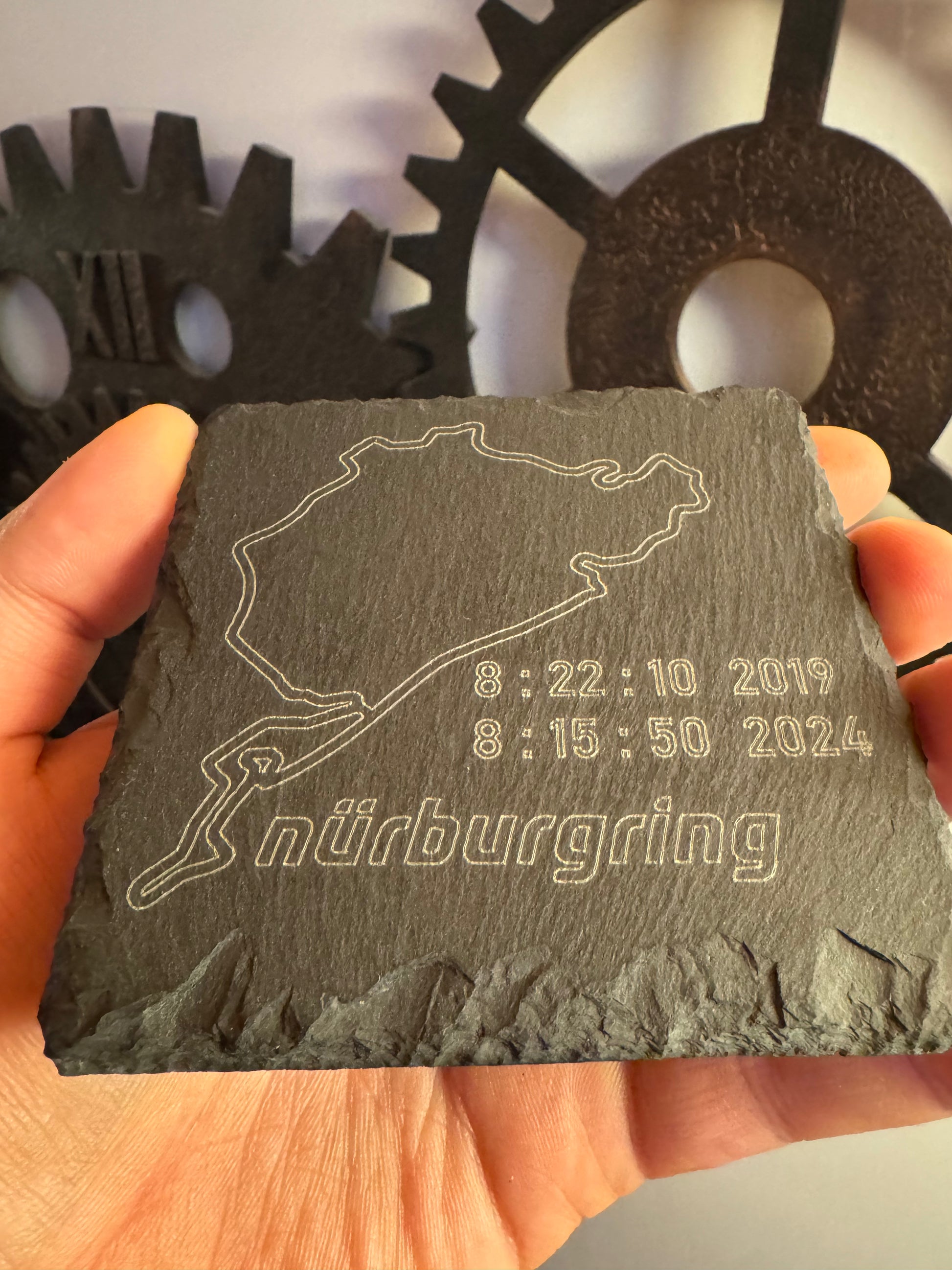 Sous verre en ardoise 10cm x10cm gravure réalisée par Nico sur le thème du circuit.